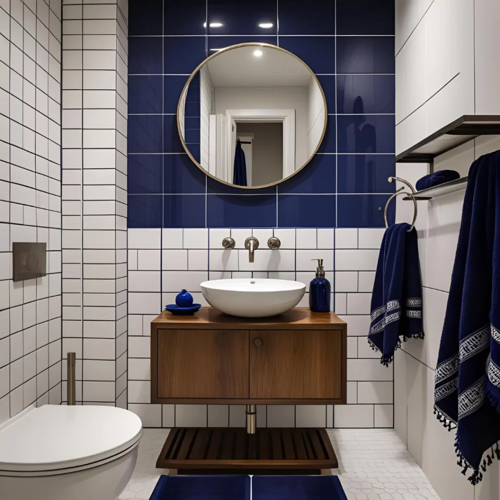 Deep blues, greens, charcoals, and rich jewel tones create an intimate, luxurious atmosphere that challenges traditional white bathrooms.