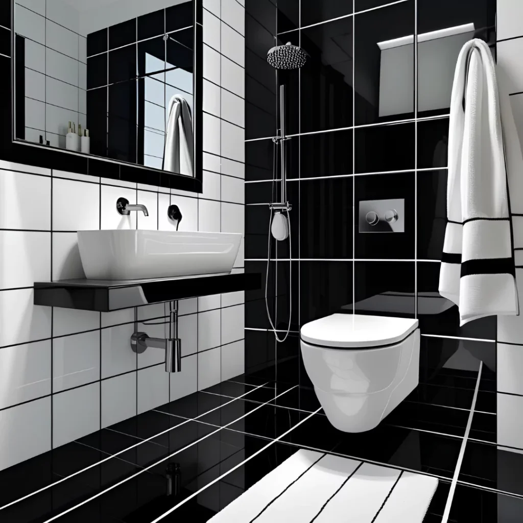 Use an all-black backdrop to highlight a pop of unexpected color — like neon pink towels, turquoise tile, or emerald accents — for a dramatic and artistic touch.
