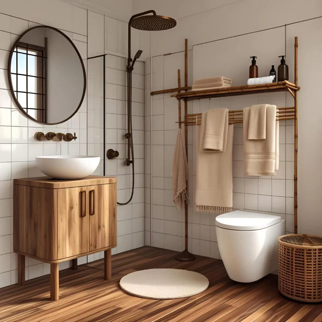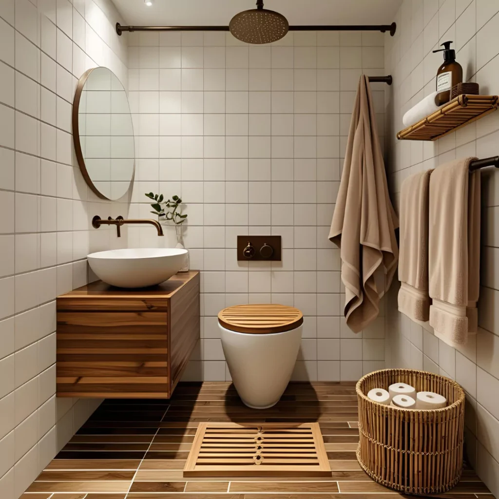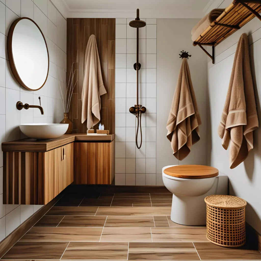 Earthy terracotta walls or floors mixed with creamy tones feel warm and Mediterranean-inspired — perfect for rustic or boho bathrooms.