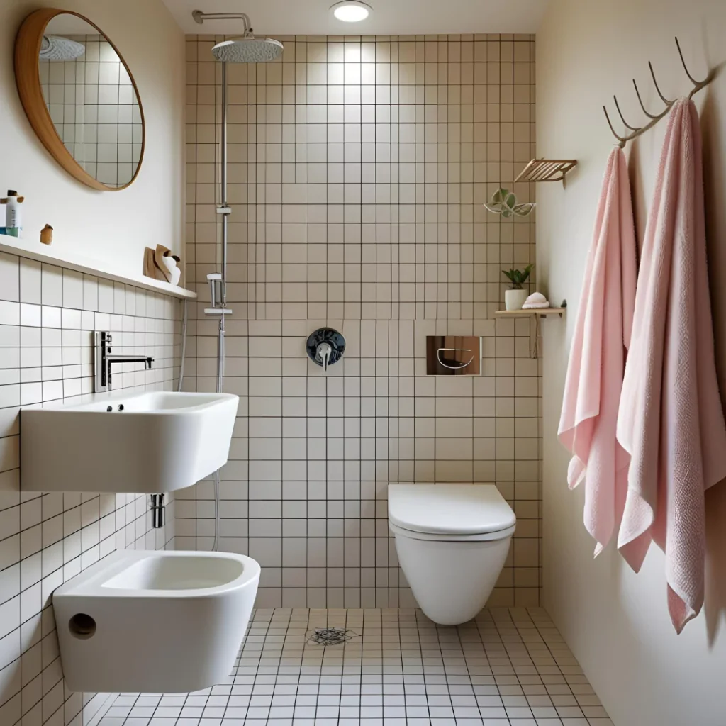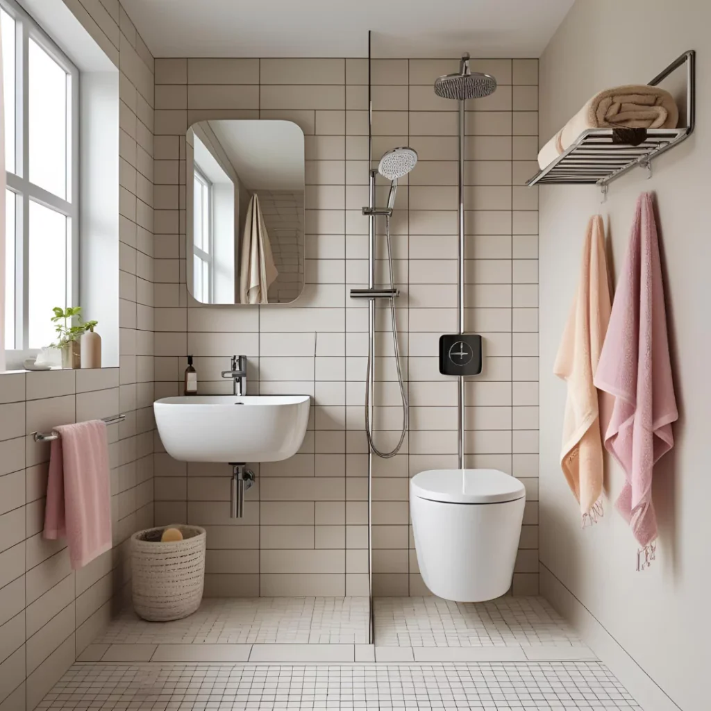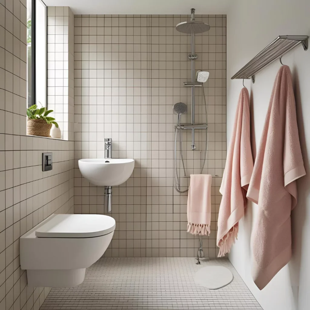 Earthy terracotta walls or floors mixed with creamy tones feel warm and Mediterranean-inspired — perfect for rustic or boho bathrooms.