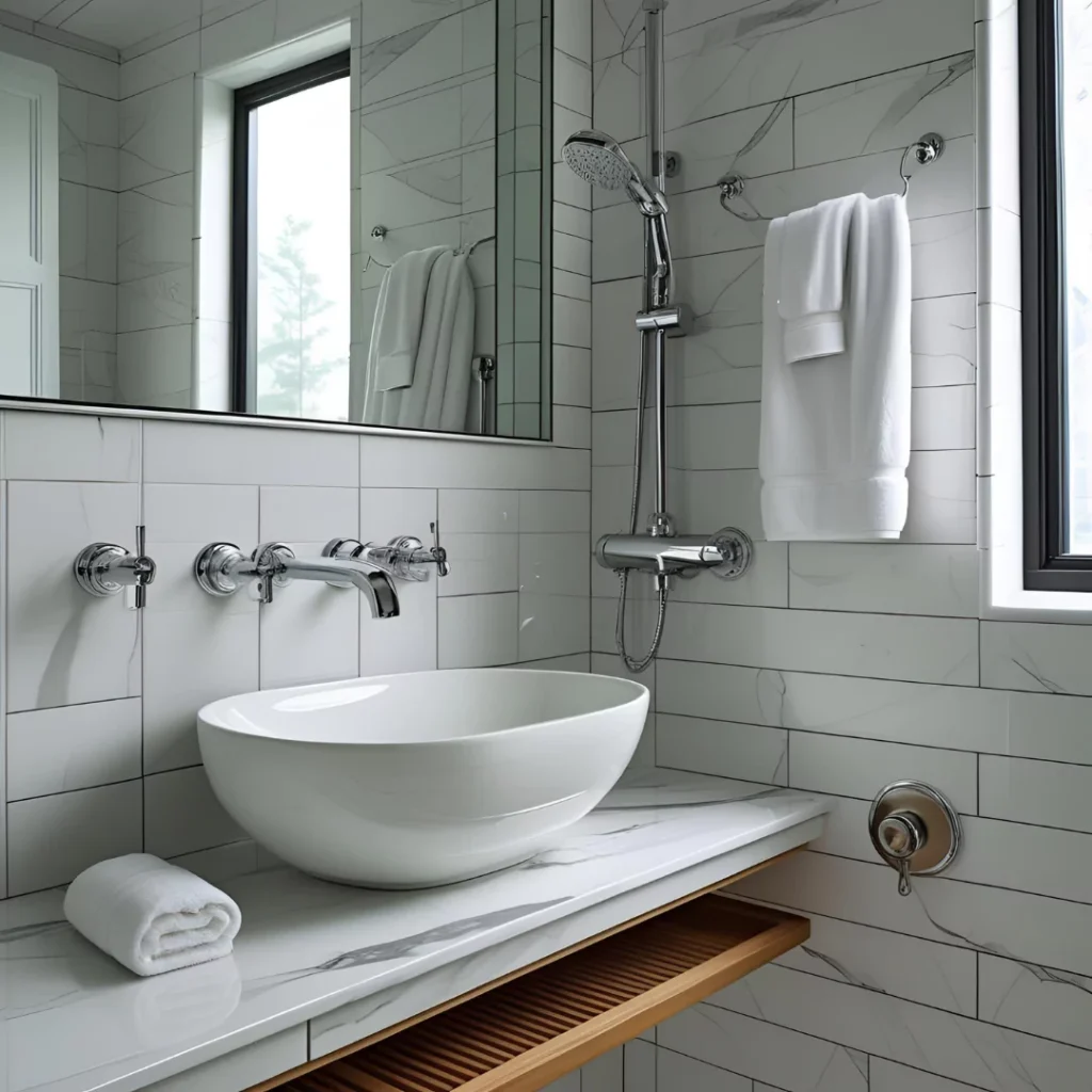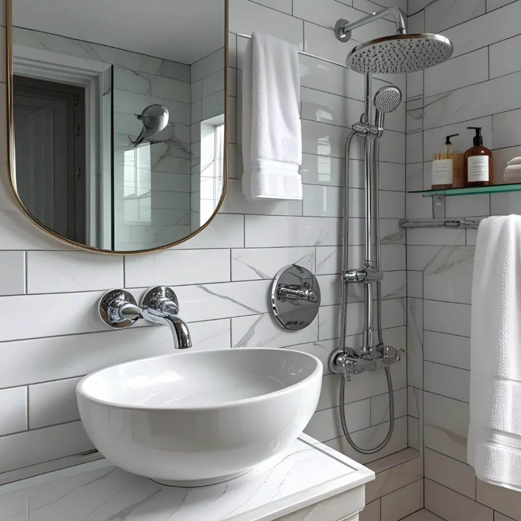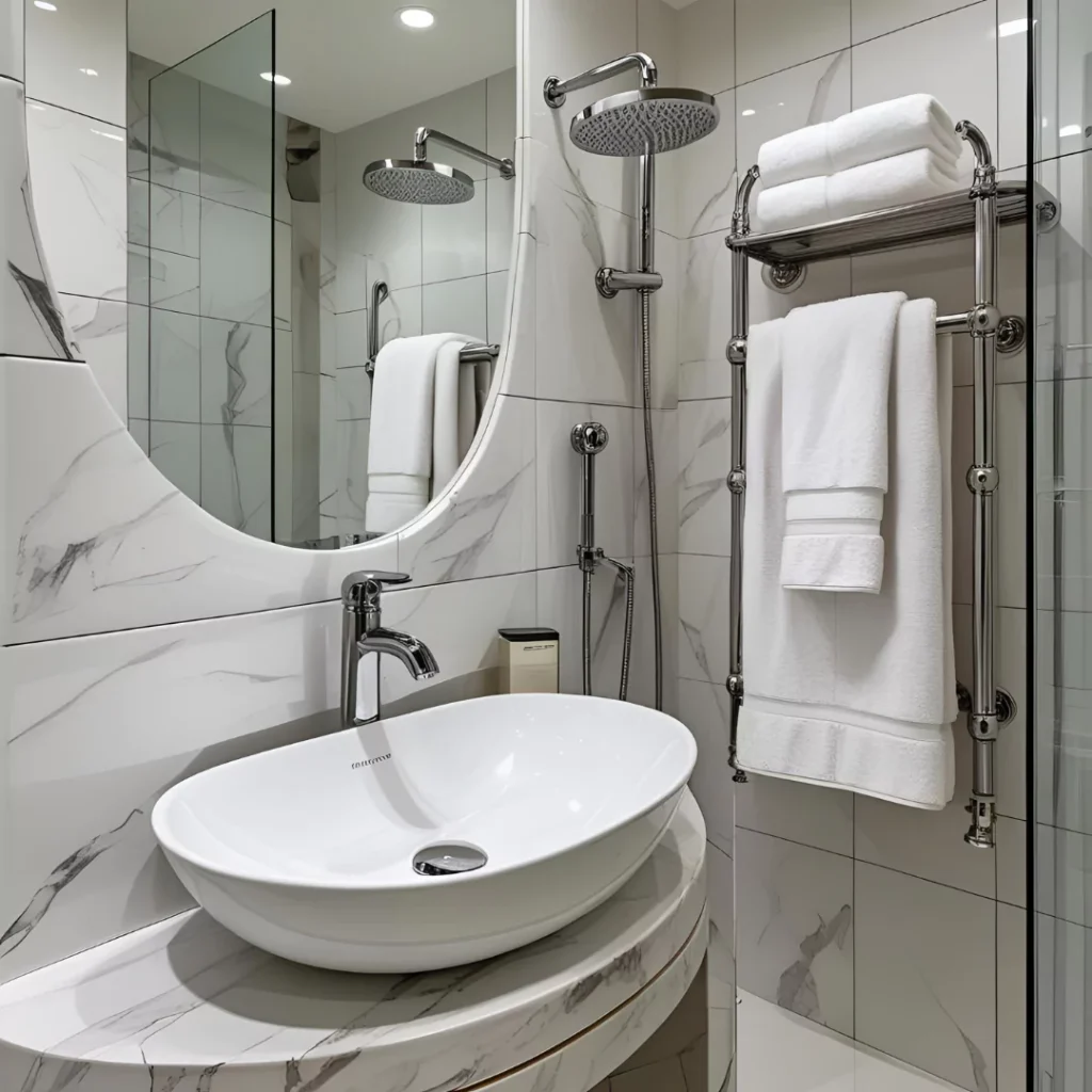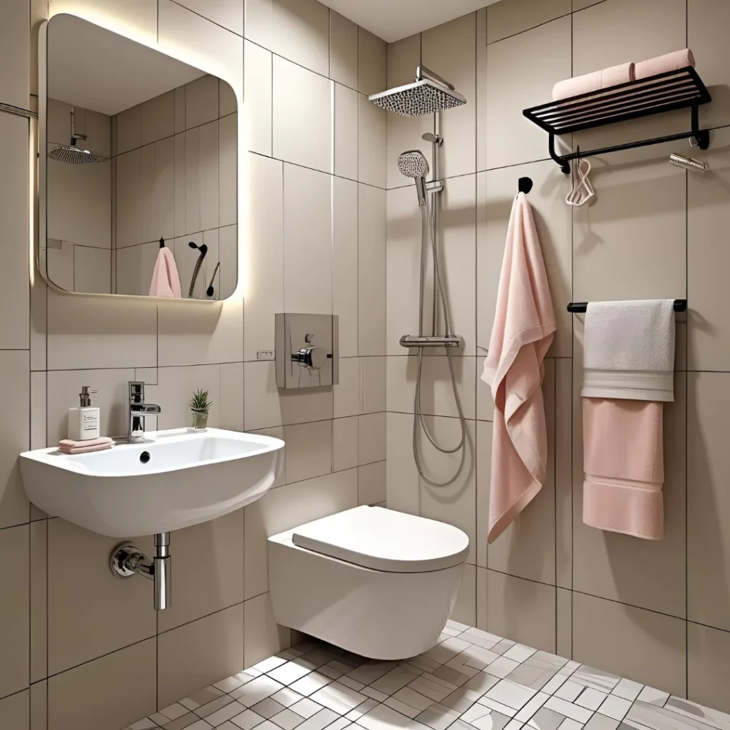 Soft blush tones paired with sleek white marble surfaces offer a perfect balance of warmth and elegance — ideal for romantic, modern bathrooms.