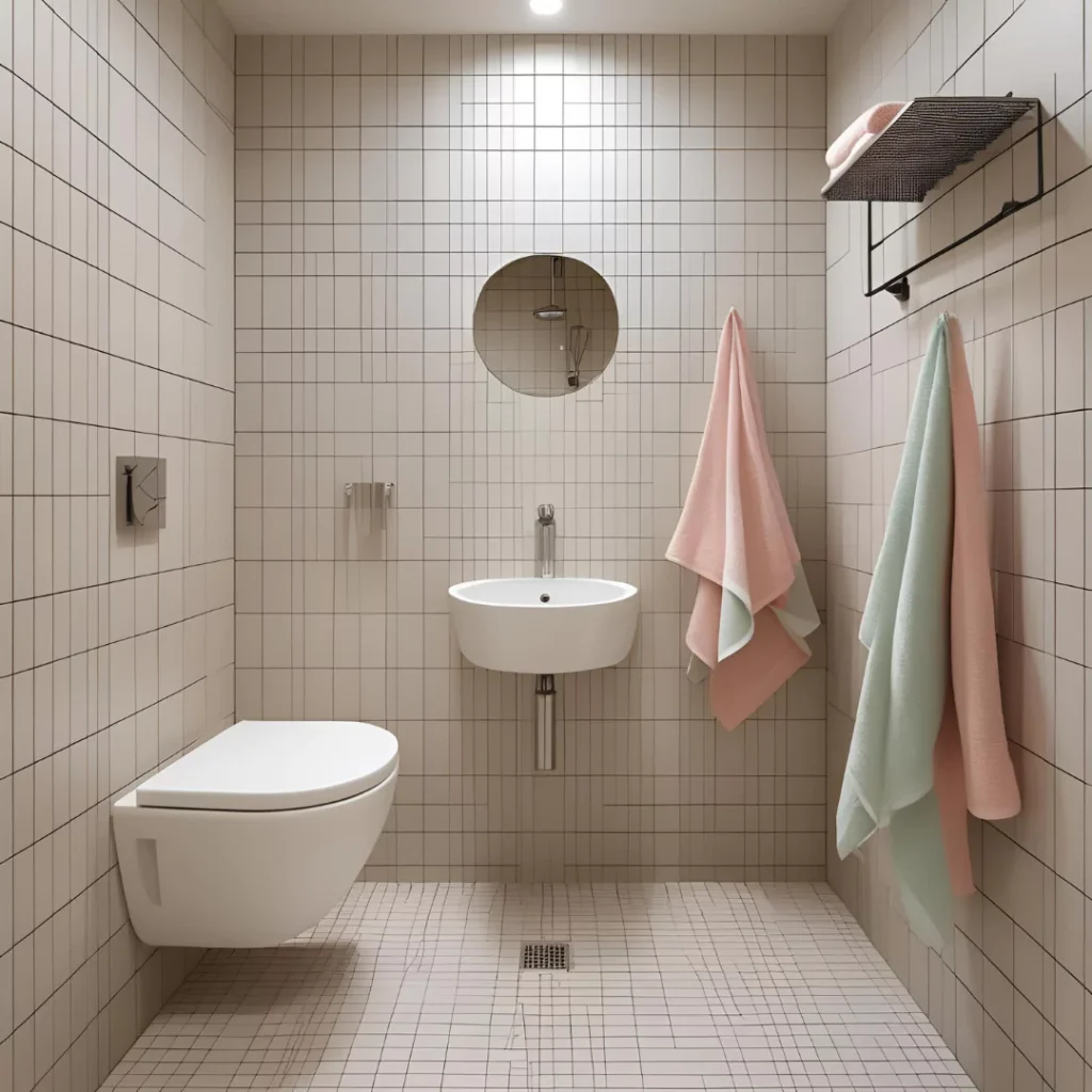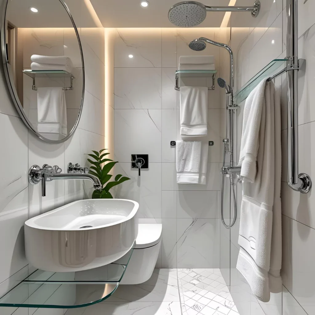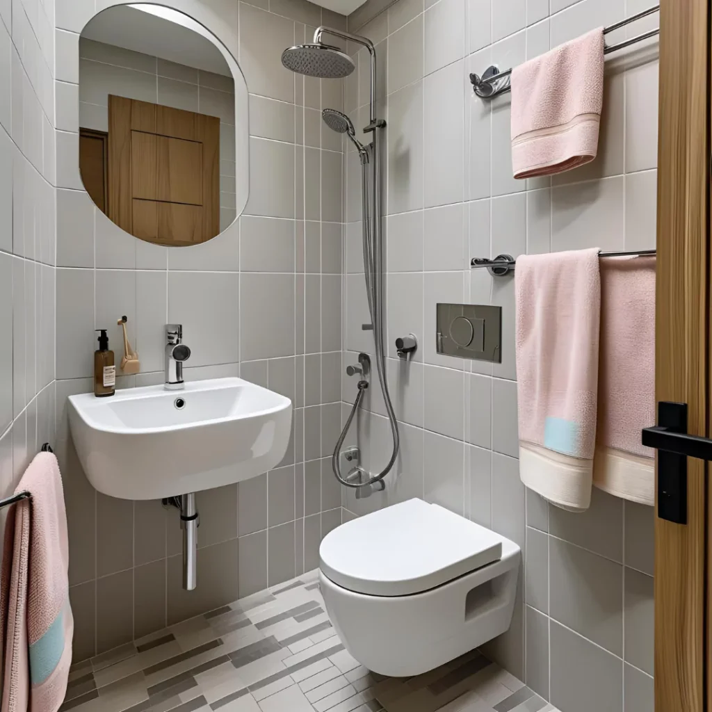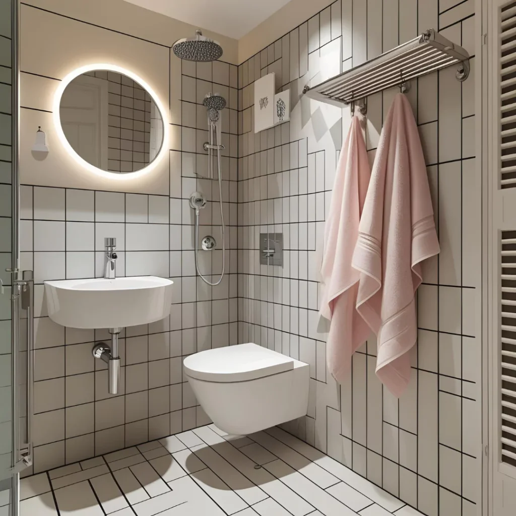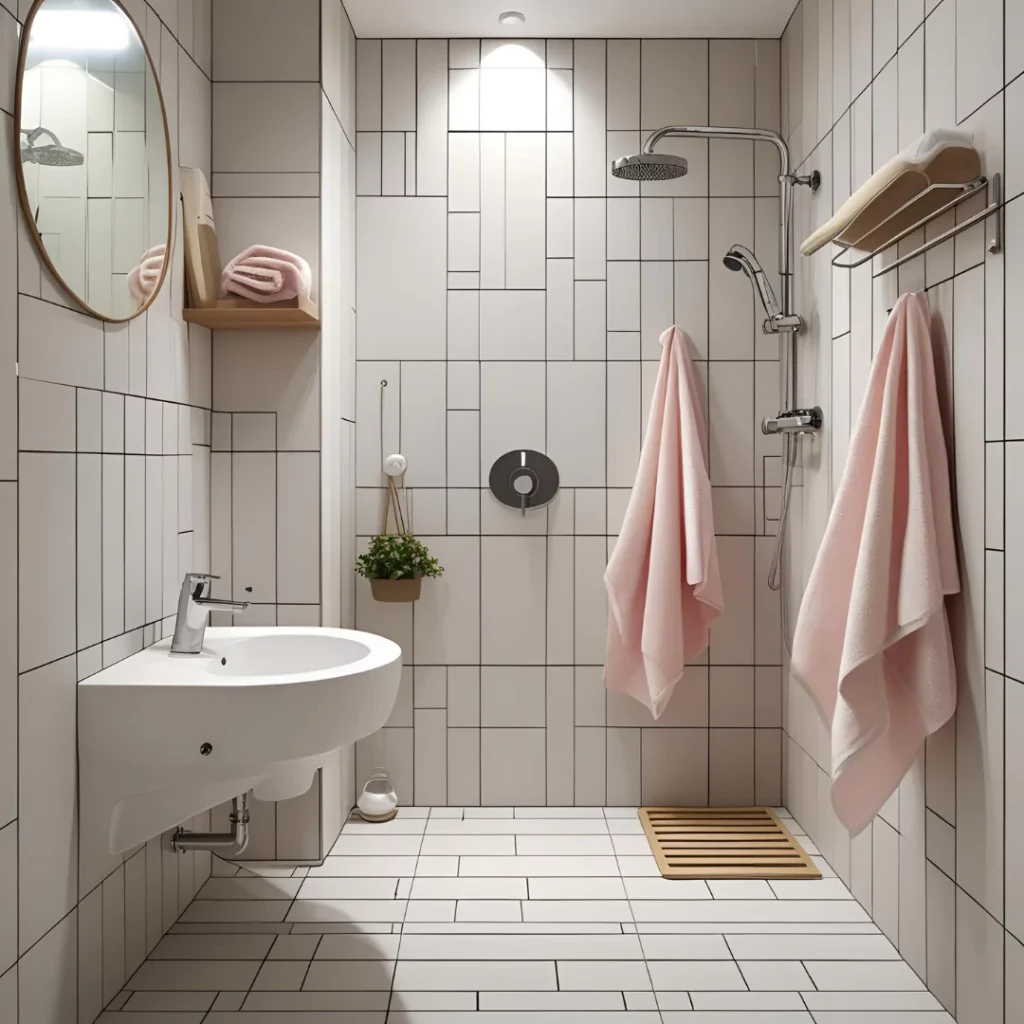 Soft blush tones paired with sleek white marble surfaces offer a perfect balance of warmth and elegance — ideal for romantic, modern bathrooms.